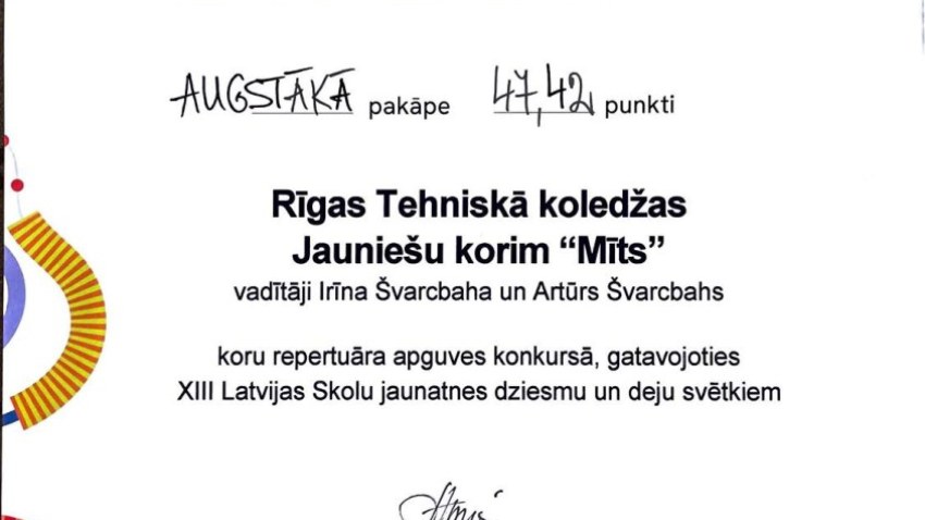 Lepojamies ar Rīgas Tehniskās koledžas kora "Mīts" iegūto augstāko pakāpi koru repertuāra apguves konkursā, gatavojoties XIII Latvijas Skolu jaunatnes dziesmu un deju svētkiem. Paldies kora vadītājiem Irīnai Švarcbahai un Artūram Švarcbaham!