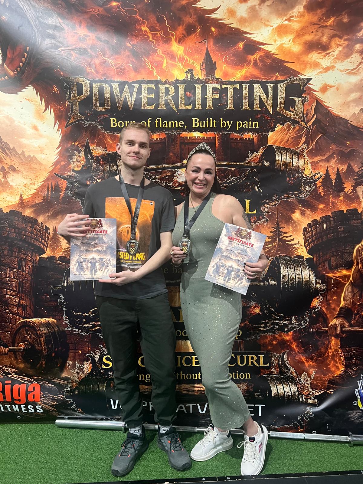 Squat: 85 kg; Bench press: 47.5 kg; Deadlift: 125 kg; Kopsumma: 257.5 kg