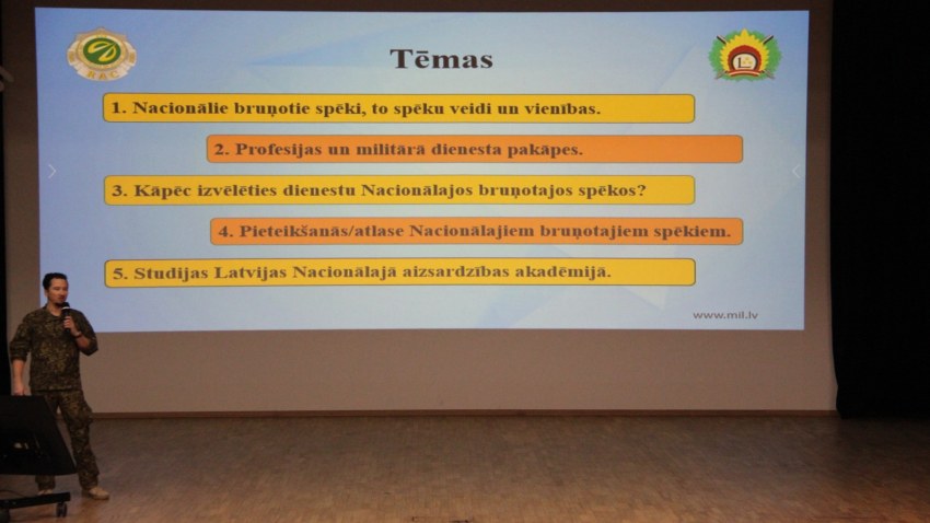 Lai jauniešus orientētu uz sabiedrības vērtībām un veicinātu izpratni par mūsdienu ģeopolitisko situāciju pasaulē, 21.martā Braslas ielā 16, Lielajā zālē notika 2.un 3. kursu audzēkņu tikšanās ar Nacionālo Bruņoto spēku Rekrutēšanas un atlases centra pārstāvi, virsleitnantu Māri Otaņķi. Jaunieši tika iepazīstināti ar tām inženiertehniskajām specialitātēm, kas nepieciešamas Bruņotajiem spēkiem un iespējām tās apgūt dažādās mācību iestādēs.