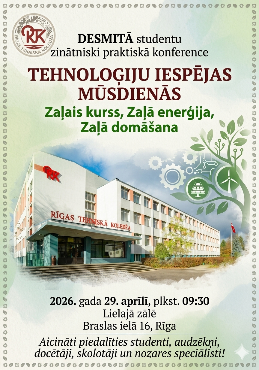 Rīgas Tehniskā koledža ielūdz studentus, audzēkņus, docētājus un nozares speciālistus piedalīties desmitajā jubilejas zinātniski praktiskajā konferencē, kas veltīta aktuālākajiem tehnoloģiju un ilgtspējas jautājumiem.