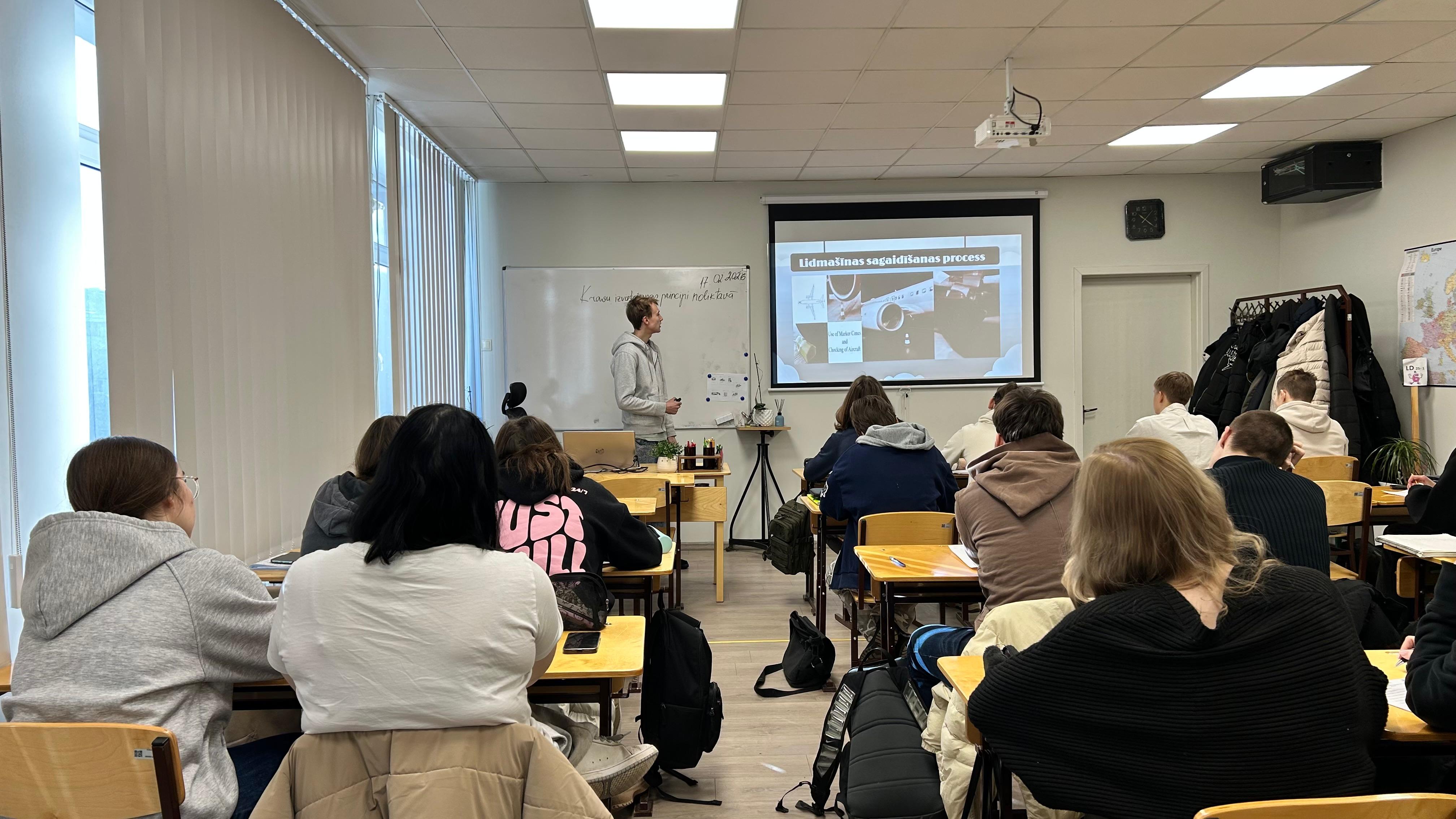 Lai sniegtu ieskatu loģistikas darbinieka mācību procesā un prakses norisē 17.02.2026 pie LD25-1, LD25-2 ciemojās mūsu koledžas bijušais absolvents Dominiks Dadzītis. Vizītes ietvaros D.Dadzītis dalījās savā pieredzē par pavadīto laiku RTK, iegūto prakses un darba pieredzi tādos uzņēmumos kā Depo, BLS, Vilks, Havas Latvia un Omniva. Sniedza ieskatu un daudz praktiskus piemērus par aviācijas nozari, kurjera pakalpojumiem un to nozīmi loģistikā.
