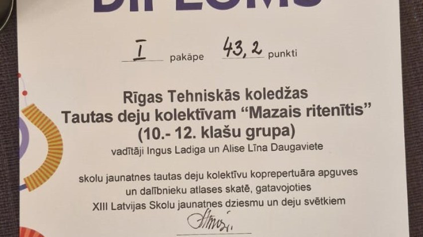 Lepojamies ar RTK tautas deju kolektīva "Mazais Ritenītis" iegūto 1.pakāpi skolu jaunatnes tautas deju kolektīvu koprepertuāra apguves un dalībnieku atlases skatē, gatavojoties XIII Latvijas Skolu jaunatnes dziesmu un deju svētkiem.