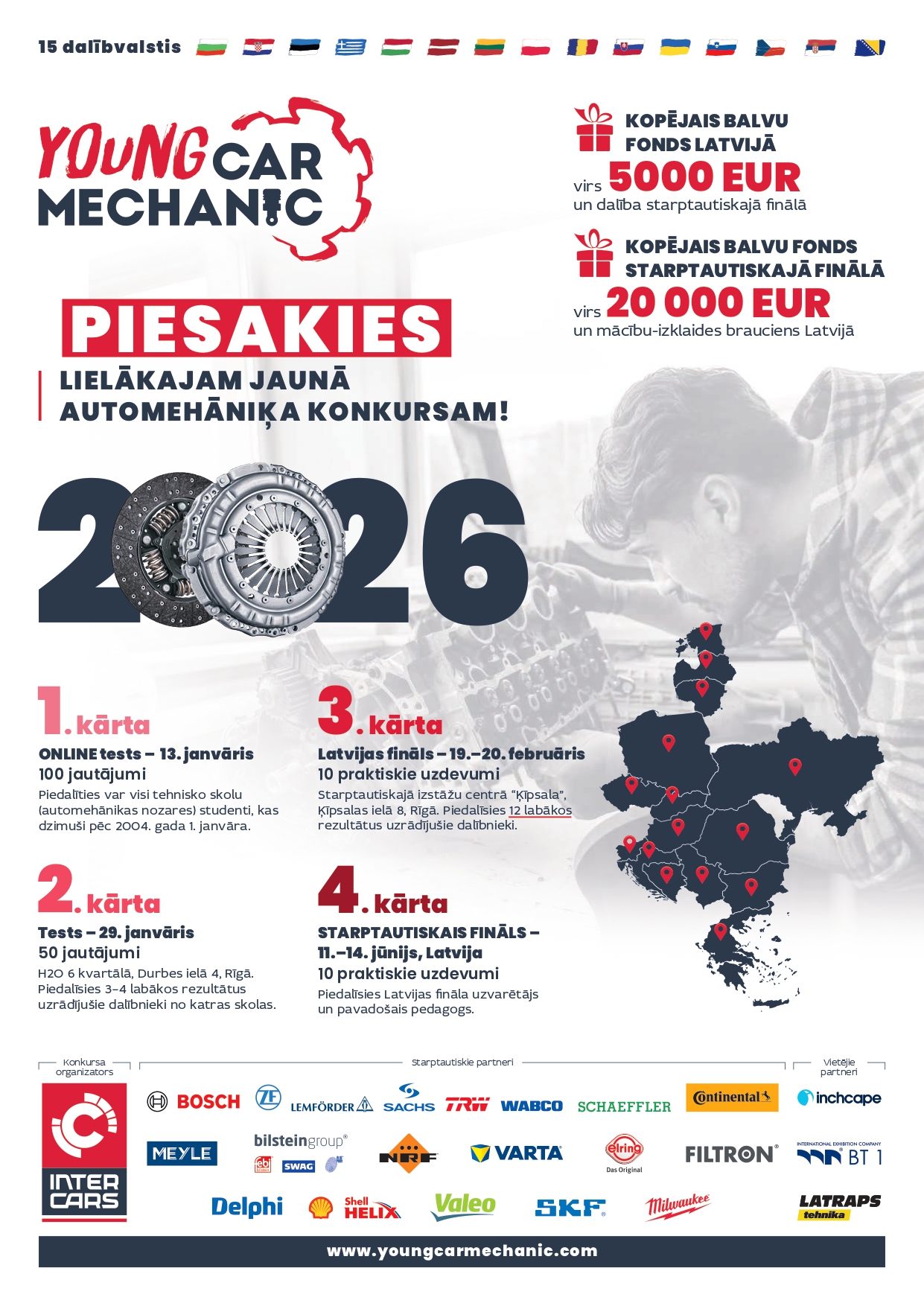 Mūsu audzēkņi – Ruslans Ševčuks, Ralfs Kucenčeirs un Krišjānis Otomers – ir izvirzīti uz nacionālo trešo kārtu profesionālās izglītības iestāžu audzēkņiem profesionālās meistarības konkursā „Young Car Mechanic 2026”.